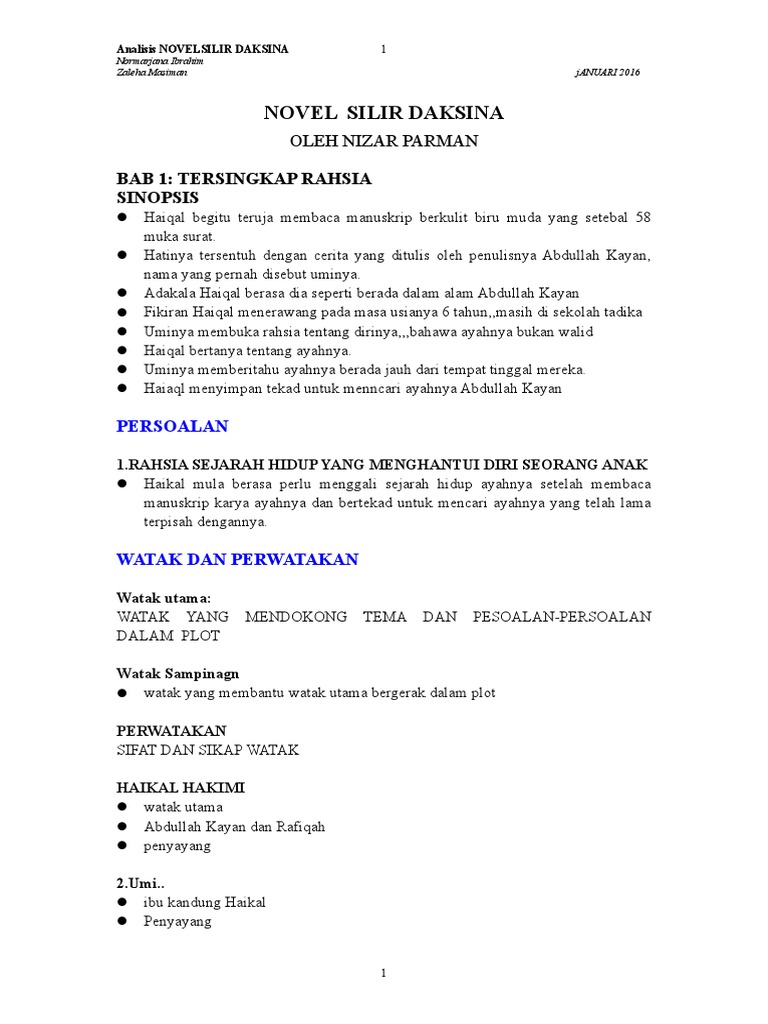 Keputusan untuk berhenti budaya dan bahasa Melayu. Dia tidak berpeluang untuk mengenali ayahnya kerana dipisahkan oleh ibunya. ANALISIS WATAK DAN PERWATAKAN NOVEL SILIR DAKSINA TINGKATAN 5.