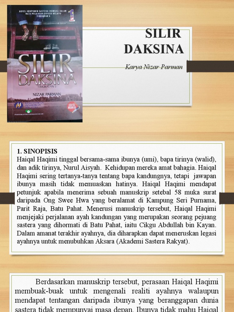 Silir Daksina Peristiwa Menarik. Haiqal sering memenangi pertandingan mendeklamasikan puisi dan menulis sajak serta puisi. Novel yang saya kaji di Tingkatan 5 ialah Silir Daksina karya Nizar Parman.